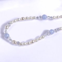 柔らかなラベンダーブルーのが魅力のブルーレースと艶のある淡水パールのライス型を組み合わせたシンプルなデザインネックレスです。