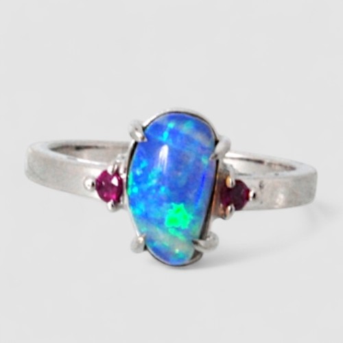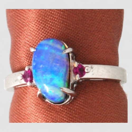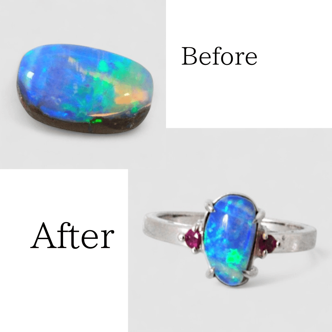 両サイドに小さなルビーを一石ずつ添え、 深い赤をアクセントにすることで、オパールの色彩が一層引き立つデザインになりました。