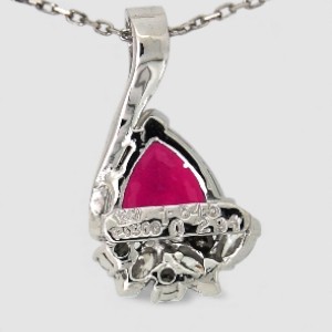 三角形のトリリアントがきれいに見えるよう、片側から流れるようにプラチナ枠をデザインし、 胸元で石が正面に見えるバランスに整えました。