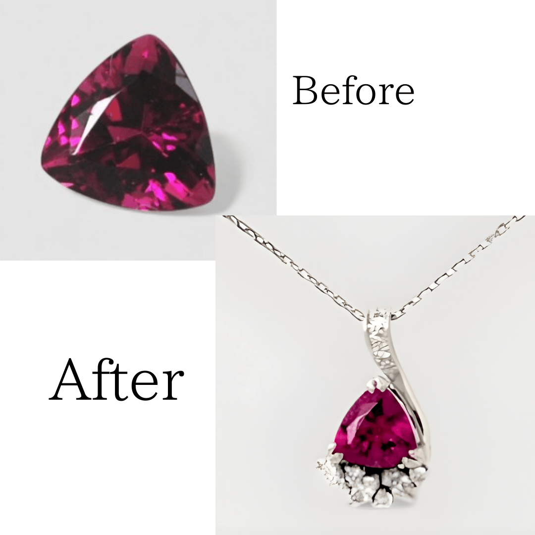 ご来店のN様が店頭でトリリアントカットのピンクトルマリンを気に入り、 「この石でプラチナのペンダントを作りたい」とオーダーをご相談くださいました。