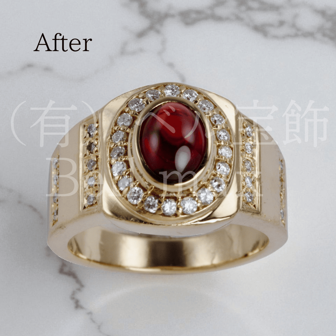 石の雰囲気に合わせて、ガーネット(カボション)を新たに手配し、丁寧にセッティングしました。