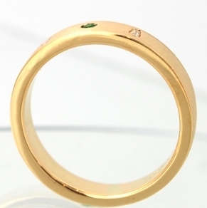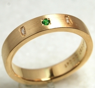 テーパーダイヤとグリーンガーネットを配置し、シンプルな中にも個性が光るデザインに。