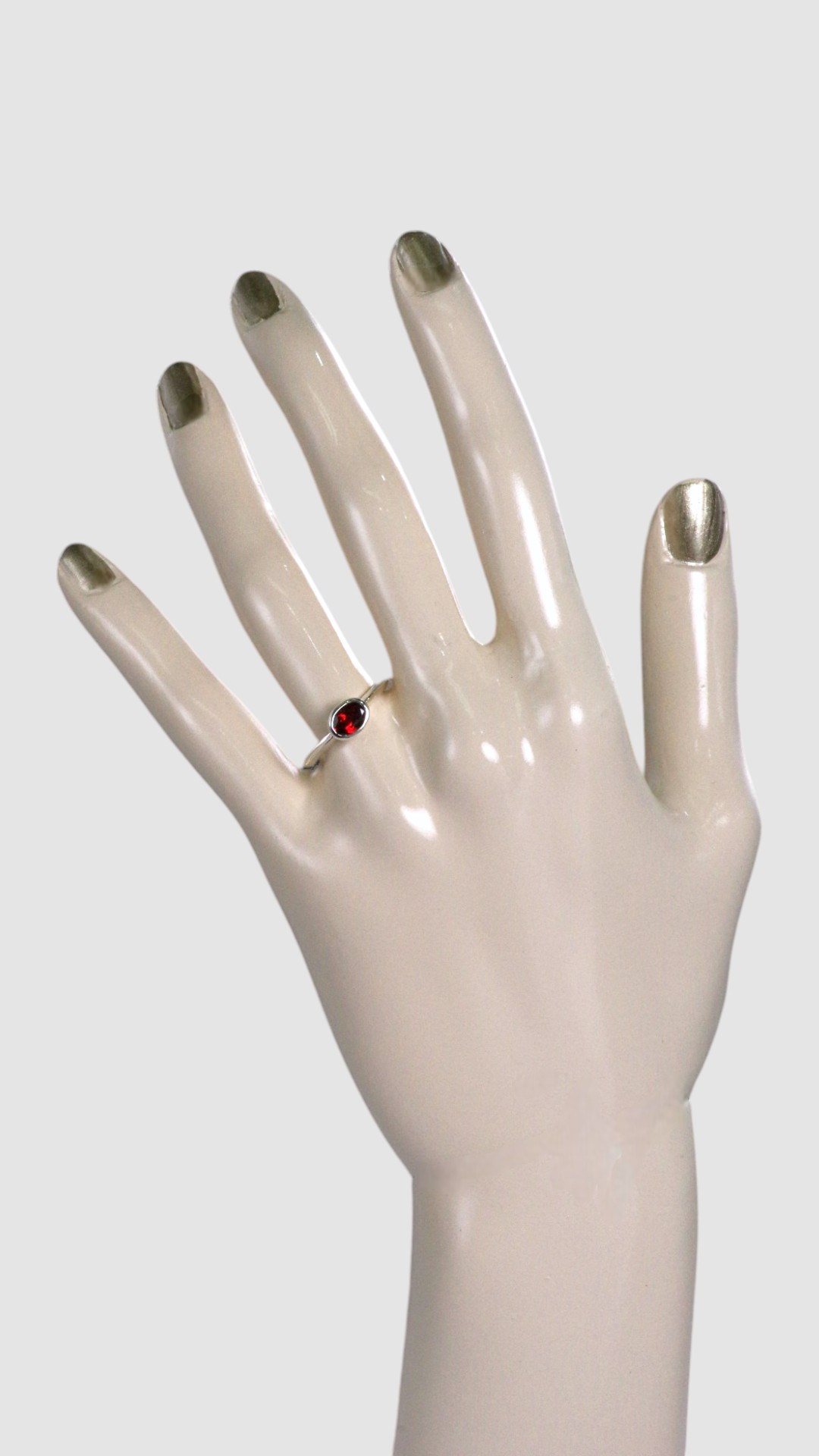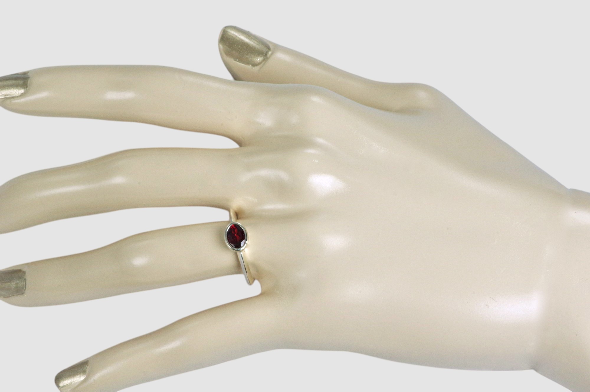 約5×7mmのガーネットルースを、シンプルな覆輪留めリングに仕立てました。