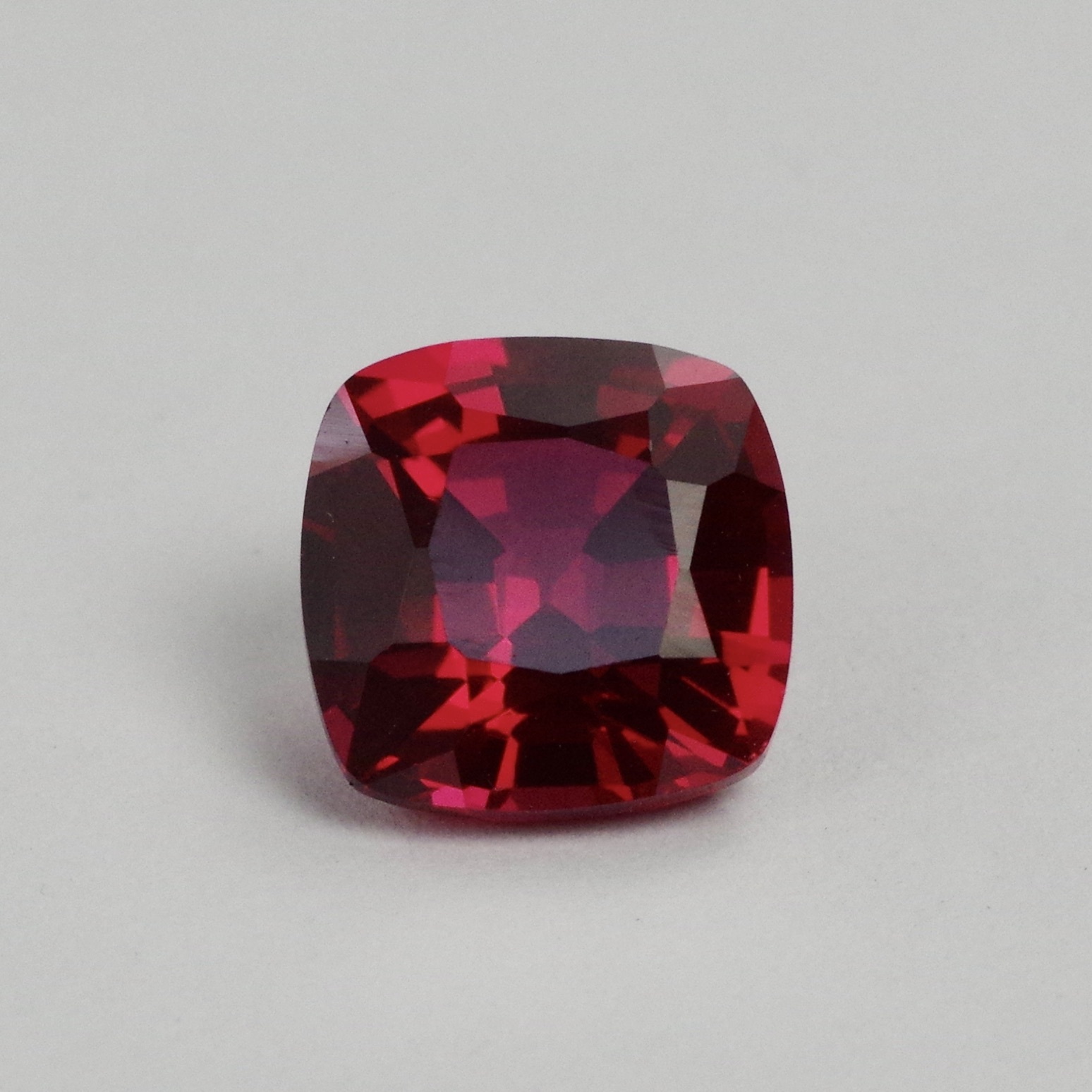 ルビー再結晶(人工石)ルース 4.177ct。約8.9〜9mm角のスクエア(クッション系)シェイプで、 鮮やかなレッドが際立つ存在感のある一石です。
