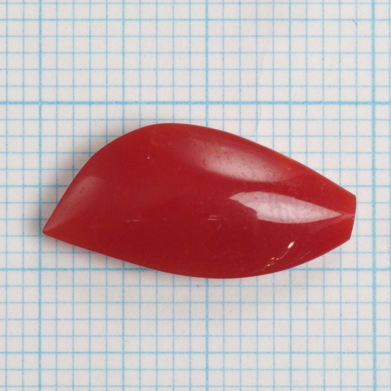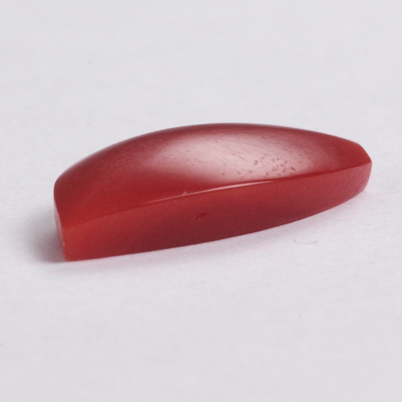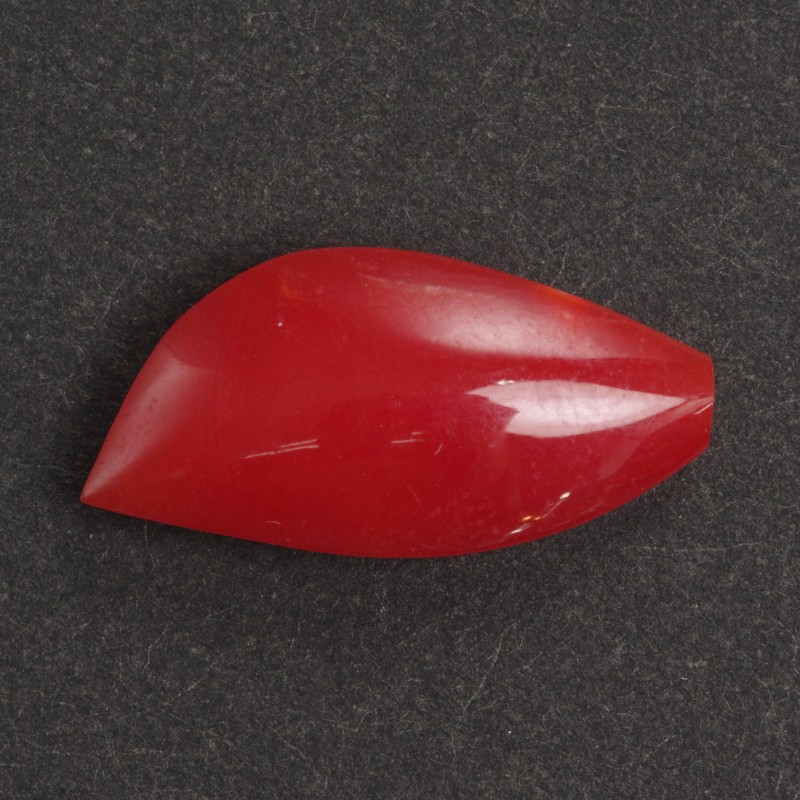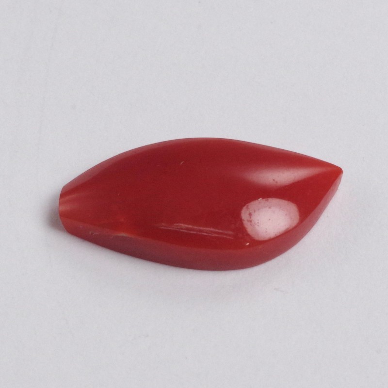 約18.7mm×約9mm、重さ0.26匁(約1g)の存在感ある血赤珊瑚のルースです。艶やかな美しい照りと、深みのある赤色が魅力です。