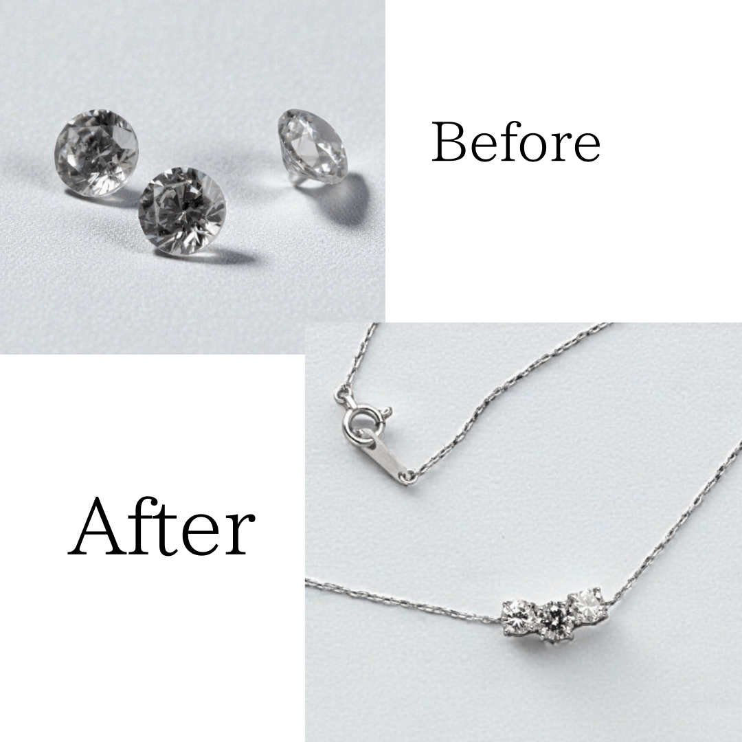 お持ち込みいただいたダイヤモンド3石で、 横並びのペンダントを制作した事例です。