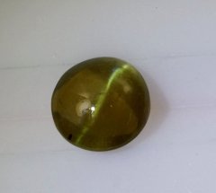 猫の目を思わせる一筋の線(キャッツアイ効果)が中央にびしっと綺麗に光ってるのが見られるオリーブ色系のキャッツアイです。