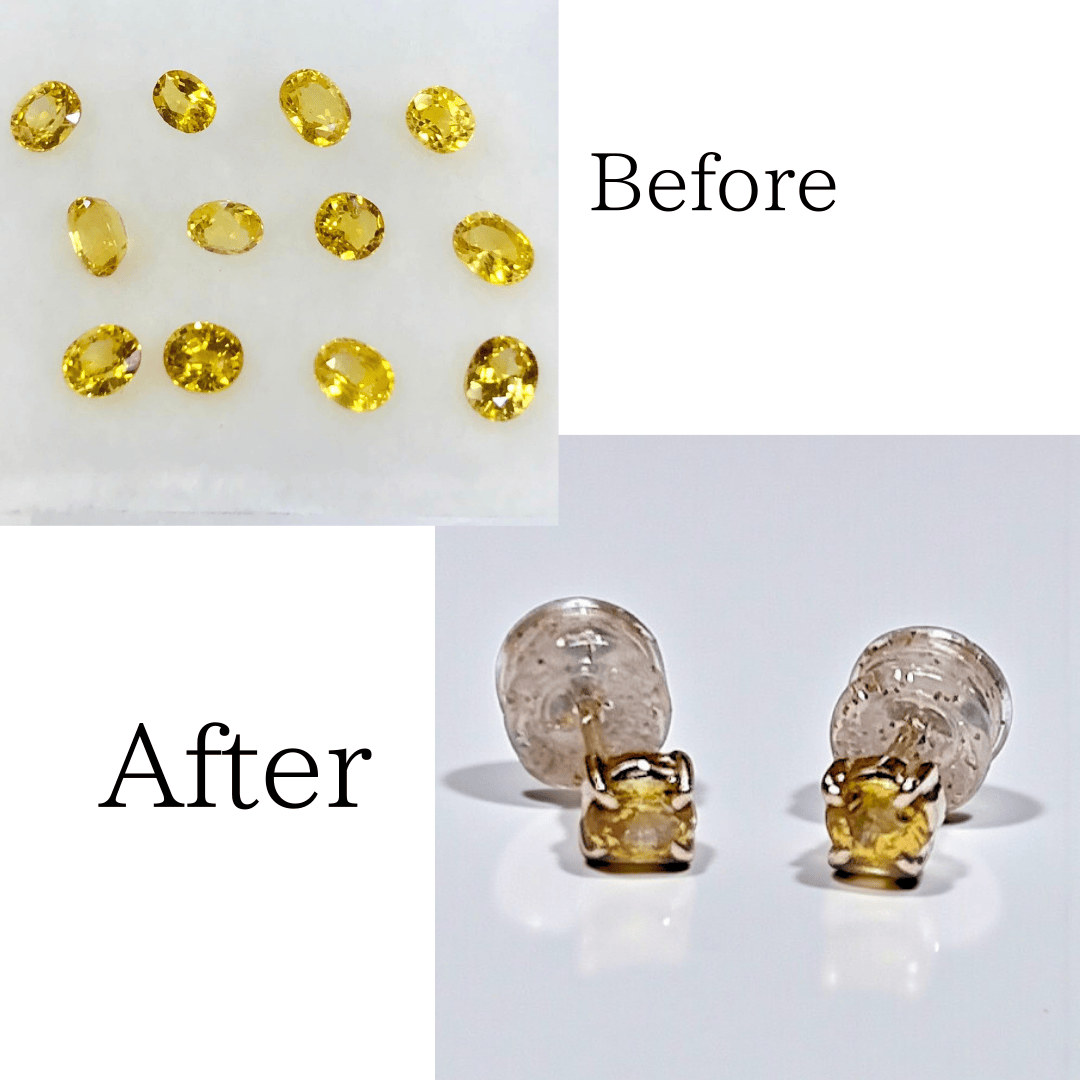 当店在庫のイエローサファイアで、普段使いしやすいK18イエローゴールドの シンプルなスタッドピアスを作りたいというご相談でした。