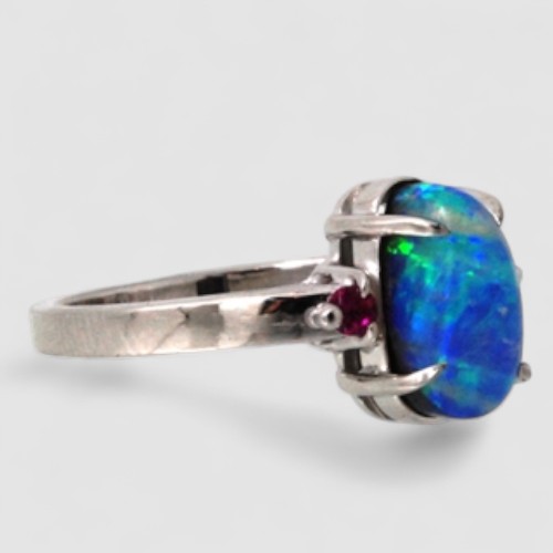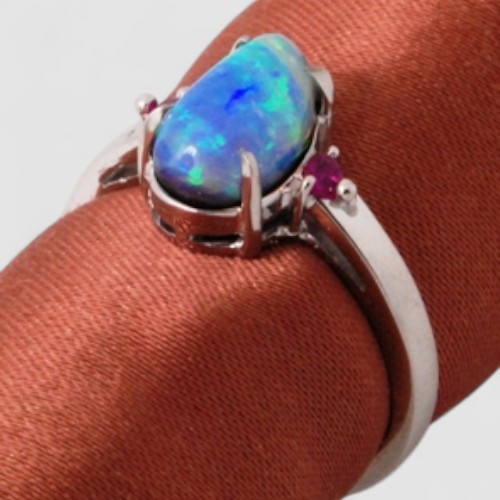両サイドに小さなルビーを一石ずつ添え、 深い赤をアクセントにすることで、オパールの色彩が一層引き立つデザインになりました。
