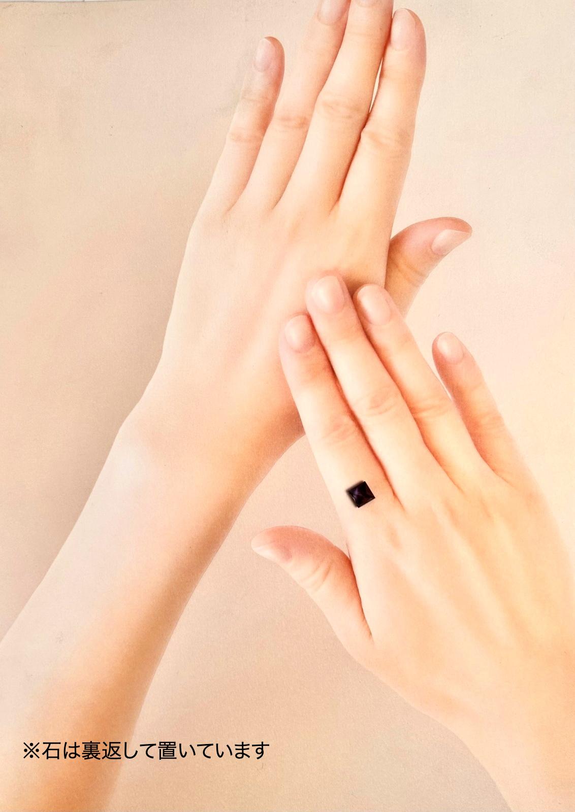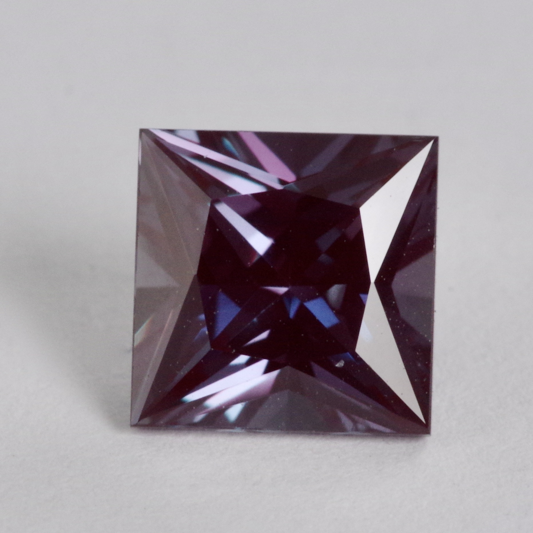 アレキサンドライト再結晶(人工)ルース 2.17ct。約7×7mmのスクエアカットは、シャープで洗練された印象に仕上がります。 天然と同じくカラーチェンジもしっかり楽しめるのが魅力です。